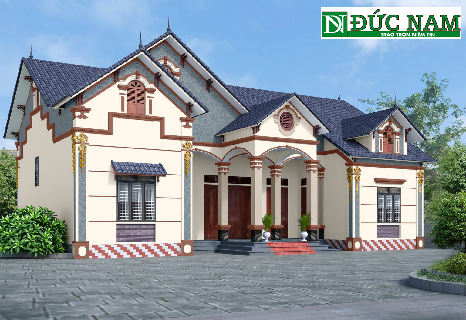 Công trình sử dụng màu sơn vàng kết hợp với phào chỉ đỏ nâu phù hợp với gia chủ mệnh hỏa